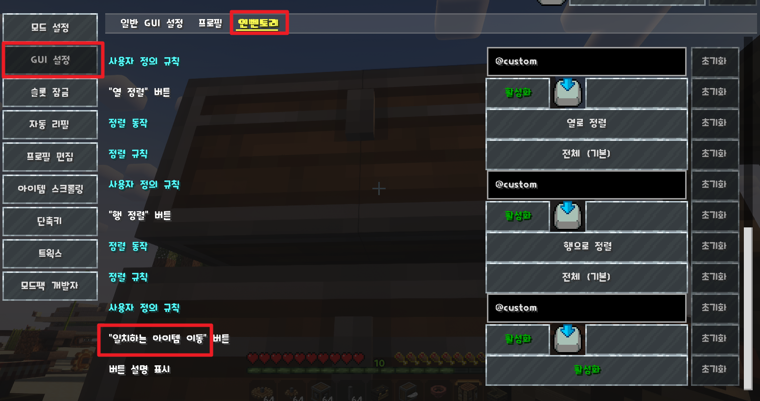 첫번째화면 메뉴에서 전체 아이템 정렬 규칙을 선택할 수 있다. 혹은 버튼마다 정렬규칙을 설정해 줄 수 있다.(GUI 설정)